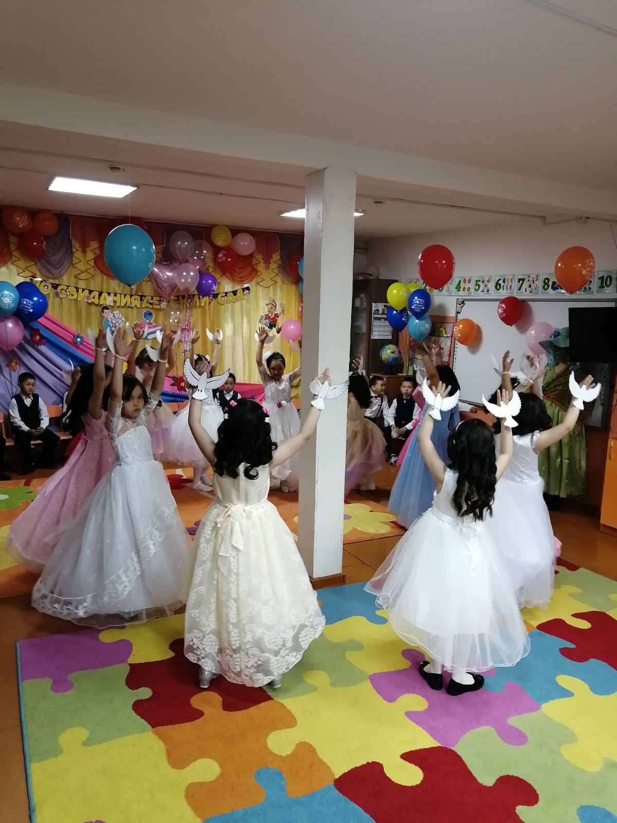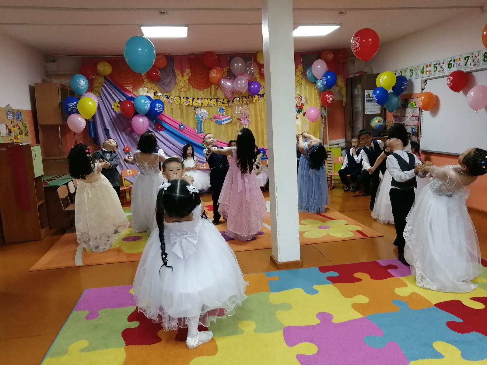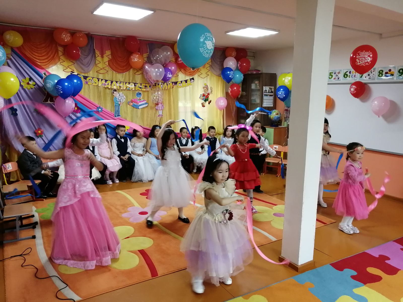Подготовка к выпускному утреннику была очень волнительной и ответственной. Были на празднике красивые песни «Оореникчи болдум», «Скоро в школу», «У моей России длинные косички!», «Круто ты попал ты в детский сад!», и танцы – «Танец джентельменов», «Современный танец с ленточками», «Вальс выпускников», «Голубь мира», игры и подарки. Но не обошлось без приключений. Большим сюрпризом для ребят стало появление сказочных героев: Старик Хоттабыч, Кикимора, Незнайка. Все герои – это были наши воспитатели. Большое им спасибо от имени сотрудников детского сада и родителей выпускников за эту сказку! Ребята получили в награду подарки и дипломы выпускников. Завершился выпускной праздник заключительной песней «Круто ты попал в детский сад!»